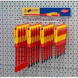 Livrare fără scule incluse. Execuţie stabilă, pentru fixare pe pereţi din panouri perforate. Cu 4 cârlige pentru şurubelniţe. Capacitate: 6 - 8 şurubelniţe pe fiecare cârlig. Echipare în funcție de doleanțe. Expunere fără dotare; comandaţi şurubelniţele separat.