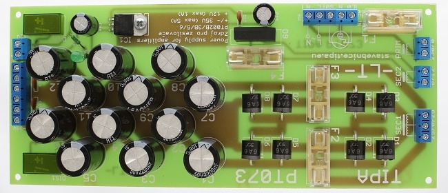 Kitul de asamblare PT073, care este o sursă de alimentare pentru amplificatoare audio de putere. Trebuie remarcat de la început că kitul este personalizat pentru conectarea la circuitul TDA7293 sau echivalentul TDA7294, care sunt utilizate în kiturile PT002B, PT003B, PT005 și PT006 ale companiei noastre. Este posibilă și utilizarea altor conexiuni de amplificator, totuși rețineți că parametrii sursei pot să nu fie cei mai adecvați. Circuitele TDA au nevoie de o sursă de alimentare DC simetrica echilibrată pentru a asigura această conexiune. În plus, sursa de alimentare este echipată cu un al doilea canal independent pentru conectarea dispozitivelor de suport pentru funcționarea amplificatorului care necesită o sursă stabilizată neechilibrată de 12 V cu un consum total maxim de până la 1 A. Un astfel de dispozitiv poate include un ventilator, o închidere difuzoare întârziată sistem (PT022 ) sau indicator de excitație vu-metru ( PT024M / PT024S ).