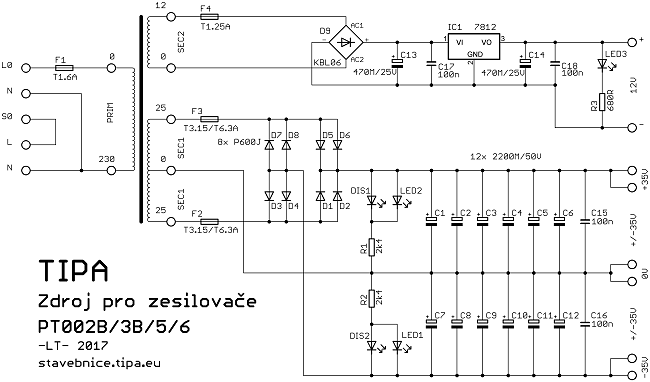 Condensatoarele C15 și C16 sunt conectate la fiecare ramură din fața bornelor de ieșire +/- 35 V, care elimină componenta armonică superioară nedorită. Rezistoarele R1 și R2 reduc tensiunea pentru DIS1, DIS2 sau LED1 și LED2, care semnalează funcționarea ramurilor individuale. Dacă dioda redresorului sau siguranța se declanșează prin supraîncărcarea sursei de alimentare, luminile de semnalizare se sting. În mod constant, 2 A pe canal pot fi preluate de la sursă fără probleme. Până la 5 A poate fi preluat de la sursă timp de maximum un minut fără a-l distruge. Printr-un calcul simplu, veți găsi că, în cazul alimentării unui amplificator de 200W (2×100 W) la o tensiune de +/- 35V, curentul consumat este de aproximativ 3 A. Cu toate acestea, 200 W este puterea de vârf pe care o atinge amplificatorul doar de câteva ori în timpul ascultării. Aproximativ un sfert din puterea de vârf, adică 50 W, poate fi considerată ca o putere medie a amplificatorului. Sursa este suficient dimensionată pentru această valoare. În mod similar, al doilea canal pentru alimentarea dispozitivelor de asistență este conectat. Tensiunea de curent alternativ aplicată blocului de borne SEC2 este alimentată prin siguranța F4 la intrarea redresorului de punte încapsulat D9. Apoi, tensiunea rectificată este filtrată cu C13 și C17 și stabilizată la 12 V cu IC1. Tensiunea stabilizată este din nou filtrată de C14 și C18 și alimentată la blocul de ieșire de 12 V. R3 reduce tensiunea pentru LED3, care semnalizează din nou funcționarea acestui canal. Luăm o tensiune de 12 V DC de la ieșire, în timp ce curentul continuu maxim este de 1 A. Tensiunea de intrare AC a acestui canal aplicată SEC2 nu trebuie să depășească 20 V. Valoarea ideală a sursei de alimentare de intrare AC a canalului este de 12 V.