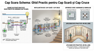 Schema cap scară permite controlul unei surse de lumină din două puncte diferite, oferind confort și siguranță sporită față de schema cu un singur întrerupător. Este ideală pentru scări, holuri sau camere cu mai multe intrări.