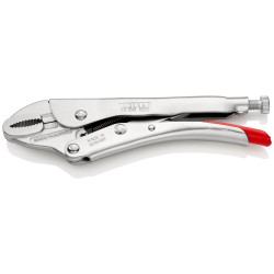 Porțiuni de prindere sigure pentru materiale rotunjite, profilate și plate. Ultrarezistent la solicitări. Cu șurub de fixare și pârghie de deblocare. Se operează cu o singură mână. Presiune de tensionare mare datorită transmisiei prin pârghia cotită. Valoarea maximă de tăiere sârmă de duritate medie Ø 2.0 mm. fălci pentru materiale rotunde, cu tăietor de sârmă.