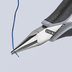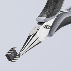 Construcție robustă, optimizată la sarcină, cu îmbinare de precizie prin știft, fără joc. Cap rotunjit cu grijă: fără margini ascuțite, care ar putea deteriora materialul. mânere disipatoare – deviază energia electrică. Manșoanele suple, îndoite în sus către capul cleștelui asigură ghidarea sigură și confortabilă chiar și între degetul mare și degetul arătător. Îndoire uniformă, pentru lucru mai eficient. Suprafețe de prindere netezite pentru o prindere fără daune. Arc dublu cu frecare redusă pentru o deschidere lină și uniformă. Polișarea cu aspect de oglindă oferă o bună protecție anticorozivă în combinație cu o peliculă fină de ulei – nu apar tulburări ale circuitului de conectare din cauza bucăților de crom care se desprind de pe suprafețe. Fălci semirotunde, cu suprafețe de prindere netezite. fălci plat-rotunde.
