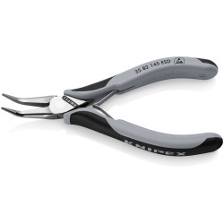 Construcție robustă, optimizată la sarcină, cu îmbinare de precizie prin știft, fără joc. Cap rotunjit cu grijă: fără margini ascuțite, care ar putea deteriora materialul. mânere disipatoare – deviază energia electrică. Manșoanele suple, îndoite în sus către capul cleștelui asigură ghidarea sigură și confortabilă chiar și între degetul mare și degetul arătător. Îndoire uniformă, pentru lucru mai eficient. Suprafețe de prindere netezite pentru o prindere fără daune. Arc dublu cu frecare redusă pentru o deschidere lină și uniformă. Polișarea cu aspect de oglindă oferă o bună protecție anticorozivă în combinație cu o peliculă fină de ulei – nu apar tulburări ale circuitului de conectare din cauza bucăților de crom care se desprind de pe suprafețe. Fălci semirotunde, înclinate la 45°, cu suprafețe de prindere netezite. fălci angulare la 45°.