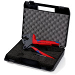O singură sculă pentru aproape 1000 de aplicaţii de sertizare: utilizabilă cu adaosuri de sertizare și elemente de poziționare auxiliare 97 49 X. mișcare de sertizare aproape paralelă. Calitate constantă a sertizării datorită inserțiilor de precizie și blocării obligatorii (deblocabilă). Presiunea de sertizare este setată cu precizie (calibrată) din fabrică, se poate regla și ulterior. Amplificarea forței prin transmisie cu pârghie în scopul unei operări fără efort. Mânere cu formă ergonomică. Diverse elemente de poziționare auxiliare pentru determinarea precisă a poziției. La cerere se pot livra adaosuri de sertizare pentru aplicații care depășesc gama sortimentului oferit. Corpul uneltei: oţel cu crom-vanadiu pentru lucrări la instalații electrice, de calitate deosebită, călit în ulei. Sertizare aprobată conform UL în combinație cu capetele de sârmă KNIPEX 97 99 330 - 399. Inserția de sertizare poate fi înlocuită cu ușurință folosind două șuruburi. Vă rugăm să consultați instrucțiunile de utilizare. în valiză de plastic; suport de spumă cu locașuri pentru păstrarea adaosurilor de sertizare și a elementelor de poziționare auxiliare; cu scule de montaj (chei cu hexagon interior), șuruburi și piulițe. fără adaos de sertizare.
