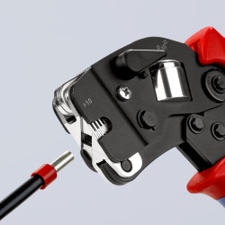 Pentru sertizarea ferulelor cf. DIN 46228 părțile 1 + 4. Adaptare prin autoreglare pe dimensiunea dorită a ferulelor: fără erori de sertizare din cauza utilizării adaosului de sertizare greșit. Introducerea frontală în sculă a ferulelor. Calitate înaltă, repetitivă de sertizare datorită mecanismului cu clichet (deblocabil). Presiune de sertizare precisă, setată din fabrică (calibrată). Forță mare de sertizare datorită acțiunii eficiente a pârghiei. Confort sporit la operare datorită construcției ușor de manevrat și greutății reduse. Sertizare aprobată conform UL în combinație cu capetele de sârmă KNIPEX 97 99 330 - 399. sertizare de la 0,08 până la 10,0 mm² și 16,0 mm² într-un singur profil. cu manetă de selectare pentru reglarea intervalului de sertizare de la 0,08 la 10 sau la 16,0 mm². Pentru ferule de cablu pereche 2 x 10 mm² și până la Ø 6,6 mm.