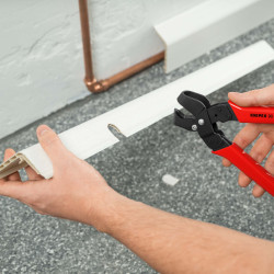 Clește special pentru crestarea decupajelor în șipcile și carcasele din plastic la lucrări de instalații electrice și sanitare. Decupajele pot fi mărite prin tăiere prealabilă și ulterioară. Muchii de tăiere fără resturi, nu este necesară cosmetizarea ulterioară a profilului tăiat. Manevrabilitate ușoară. Cu arc de deschidere, limitator de deschidere şi clichet de blocare.