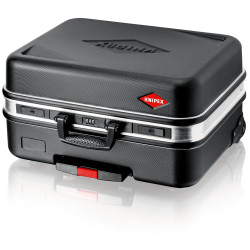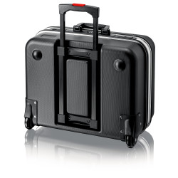 Cu un total de 54 opțiuni de inserție. Sarcină max.: 20 kg. Volum: 33 litri. Mâner de prindere stabil și ergonomic. Variantă rezistentă la uzură din material ABS-Material, negru. Cadru de aluminiu pe circumferință. Balama din metal. Compartiment pentru documente integrat în capac. Două panouri de scule amovibile din foi de PP antimurdărie, cu ghidare dublă, cu 31 de buzunare de scule. Primul panou de scule cu zece buzunare pentru scule și o bandă elastică pe partea cu capacul și unsprezece buzunare de scule înguste și unul mare pe partea cu baza. Al doilea panou de scule cu zece buzunare pentru scule și o bandă elastică pe partea cu baza și un compartiment pentru documente pe partea cu capacul. Tavă de bază, se poate fixa printr-un buton, înălțime 70 mm, poate fi subdivizată prin inserții; placă de acoperire cu 14 compartimente mari pentru scule. Set de mâner telescopic în bază, precum și două roți externe de rulare lină, silențioase. Două încuietori metalice cu rabatere și un lacăt cu combinație din trei cifre pentru încuierea în siguranță a capacului. Câmp pentru etichetă cu două autocolante pentru etichetare individuală.