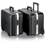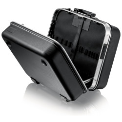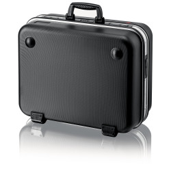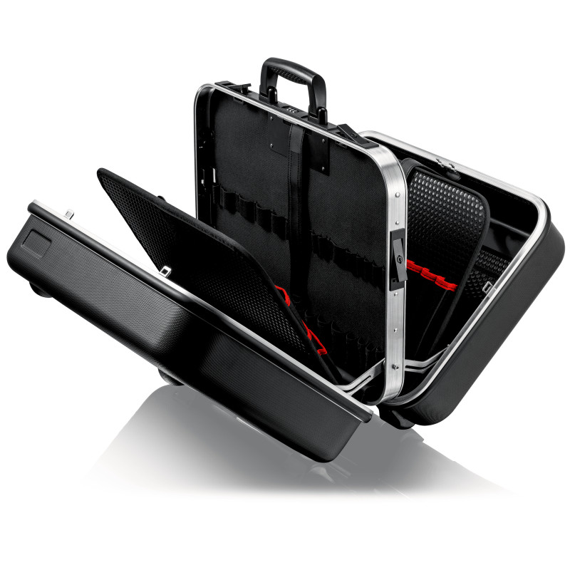 Cu un total de 95 opțiuni de inserție. Sarcină max.: 25 kg. Volum: 38 litri. Poate sta în toate pozițiile de deschidere datorită suporturilor de capac cu înclichetare și mecanism cu balama pe ambele părți, cu unghi reglabil după dorință. Poate fi deschisă de pe una dintre laturi; partea de jos și capacul pot fi deschise în mod independent unul de altul. Câmp pentru etichetă cu două autocolante pentru etichetare individuală. Variantă rezistentă la uzură din material ABS-Material, negru. Cadrul de aluminiu pe circumferință, cu perete central bine fixat, rezistent, care poate fi montat pe ambele părți, cu opțiuni de inserție versatile datorită buclelor elastice și celor douăsprezece buzunare mici. Balama din metal. Încuietoare cu combinație din trei cifre pentru securizarea trusei. Două încuietori metalice cu înclinare, pentru fixarea capacului și a bazei. Raft de documente retractabil și panou de scule retractabil realizate din foaie de PP cu pereți dubli, ce respinge mizeria, cu 13 de buzunare de scule. Piesă de fund de 58 mm înălțime, compartimentabilă cu inserții flexibile, și tăblie de acoperire cu 6 buzunare mari pentru scule, fixabilă în poziție cu un buton.