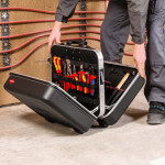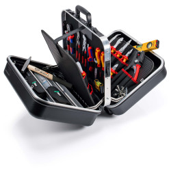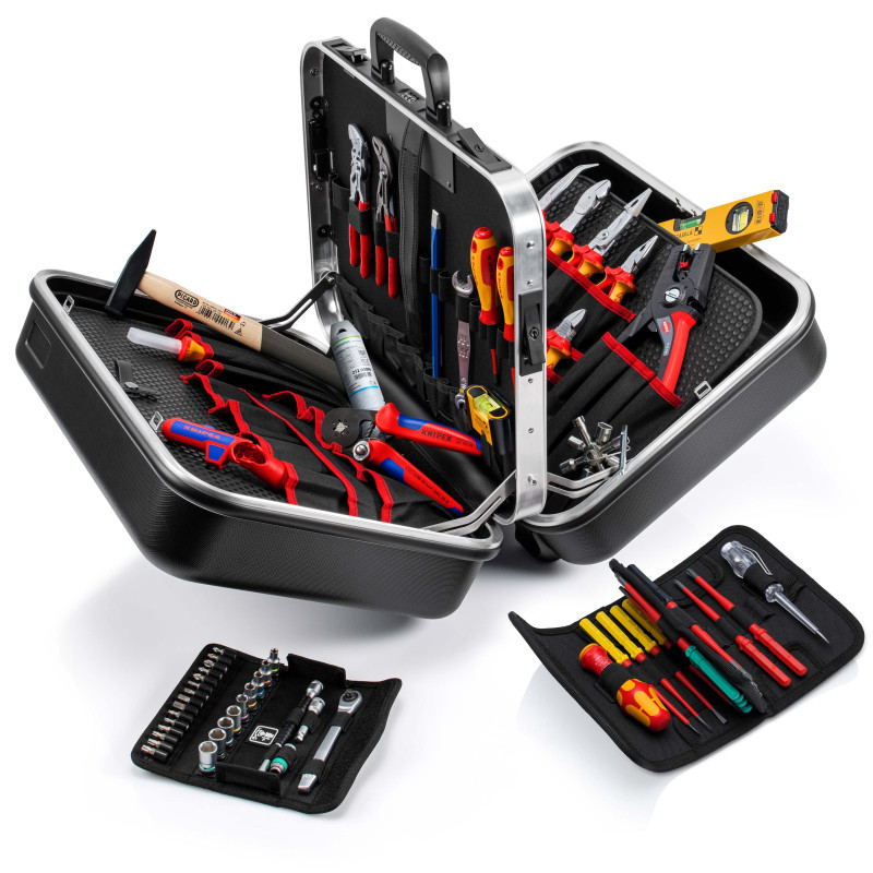 Echipată cu 14 scule KNIPEX, un total de 66 de scule de marcă, parțial testate VDE conform DIN EN 60900. Cu un total de 95 opțiuni de inserție. Sarcină max.: 25 kg. Volum: 38 litri. Poate sta în toate pozițiile de deschidere datorită suporturilor de capac cu înclichetare și mecanism cu balama pe ambele părți, cu unghi reglabil după dorință. Poate fi deschisă de pe una dintre laturi; partea de jos și capacul pot fi deschise în mod independent unul de altul. Câmp pentru etichetă cu două autocolante pentru etichetare individuală. Variantă rezistentă la uzură din material ABS-Material, negru. Cadrul de aluminiu pe circumferință, cu perete central bine fixat, rezistent, care poate fi montat pe ambele părți, cu opțiuni de inserție versatile datorită buclelor elastice și celor douăsprezece buzunare mici. Balama din metal. Încuietoare cu combinație din trei cifre pentru securizarea trusei. Două încuietori metalice cu înclinare, pentru fixarea capacului și a bazei. Raft de documente retractabil și panou de scule retractabil realizate din foaie de PP cu pereți dubli, ce respinge mizeria, cu 13 de buzunare de scule. Piesă de fund de 58 mm înălțime, compartimentabilă cu inserții flexibile, și tăblie de acoperire cu 6 buzunare mari pentru scule, fixabilă în poziție cu un buton.