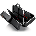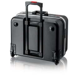 Cu un total de 95 opțiuni de inserție. Sarcină max.: 30 kg. Volum: 38 litri. Tavă de bază, se poate fixa printr-un buton, înălțime 70 mm, poate fi subdivizată prin inserții; placă de acoperire cu 13 compartimente de dimensiuni mari pentru scule. Poate sta în toate pozițiile de deschidere datorită suporturilor de capac cu înclichetare și mecanism cu balama pe ambele părți, cu unghi reglabil după dorință. Compartiment amovibil pentru documente și panouri pentru unelte amovibile din foi de PP cu pereți dubli, antimurdărie, cu 13 de buzunare de scule. Câmp pentru etichetă cu două autocolante pentru etichetare individuală. Set de mâner telescopic în bază, precum și două roți externe de rulare lină, silențioase. Variantă rezistentă la uzură din material ABS-Material, negru. Cadrul de aluminiu pe circumferință, cu perete central bine fixat, rezistent, care poate fi montat pe ambele părți, cu opțiuni de inserție versatile datorită buclelor elastice și celor douăsprezece buzunare mici. Balama din metal. Încuietoare cu combinație din trei cifre pentru securizarea trusei. Două încuietori metalice cu înclinare, pentru fixarea capacului și a bazei. Poate fi deschisă de pe una dintre laturi; partea de jos și capacul pot fi deschise în mod independent unul de altul.