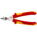 Clești de precizie testați VDE pentru lucrări de tăiere ultra-fine, de ex. în electronică și mecanică fină. Completați setul dumneavoastră de scule VDE. Tăișuri șlefuite, foarte ascuțite, fără fațetă. Tăiere prin forfecare cu margini de tăiere micro, în zig-zag, pentru tăierea de înaltă precizie chiar și a celor mai subțiri sârme și o durată lungă de viață. Vârfurile formate exact separă chiar și firele de sârmă lipite unele de altele începând cu un Ø de 0,2 mm. Articulație cu nit din oțel inoxidabil. Cursă extrem de ușoară pentru lucru cu efort redus. Cu arc de deschidere şi limitator de deschidere. Duritatea tăișurilor de cca. 54 HRC.