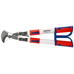 Foarfece de tăiat cabluri cu laturi telescopice reglabile şi rabatabile. Pentru cabluri de până la Ø 38 mm, laturi rabatabile pentru reglarea distanţei optime dintre laturi, recomandat și pentru operații de lucru în spaţii înguste. Utilizare confortabilă graţie principiului clichetului şi greutăţii reduse. Laturi telescopice ultrasolicitabile din äeavü ovalü de aluminiu; extensibile până la 770 mm pentru pârghie maximă în cazul unor diametre mari ale cablurilor; se pot strânge până la 570 mm pentru spațiu minim ocupat la transport. Posibilitate de înlocuire a capului de tăiere. Interval de tăiere larg până la maxim Ø 38 mm sau maxim 280 mm² (de ex. 4 x 70 mm² NYY) în cazul cablurilor de Cu și Al. Secţionare uşoară, fără resturi, graţie geometriei optimizate a lamelor. Articulaţie reglabilă cu filet.