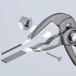 acces deosebit de bun la piesa de lucru datorita capului foarte subţire şi a zonei de îmbinare. Fălci lungi și înguste, cu striații pentru prinderea frontală: profil de prindere longitudinal pentru obiecte rotunde, cum ar fi capetele de șurub. ideală pentru service, întreţinere şi reparare echipamente, în industria auto in industrie. Apucare fermă și a pieselor plate datorită reazemului în trei puncte. Canelură transversală pentru prinderea obiectelor cilindrice subțiri, cum ar fi cuiele. Reglare fină, pentru adaptarea optimă a capacității de prindere și o poziție de prindere ergonomică. Reglare la o apăsare de buton direct pe piesă. Autoblocare pe țevi și piulițe: fără alunecare pe piesa de prelucrat, pentru un efort minim. Articulaţie perforată pentru o stabilitate ridicată graţie ghidajului dublu. înclichetare sigură a bolțului articulației: fără deplasare accidentală. Protecţia împotriva prinderii previne rănirile provocate prin strivire. Reglare fină, pentru adaptarea optimă a capacității de prindere la plăci cu lățimea de până la 32 mm și țevi cu diametrul de până la 32 mm.
