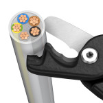 Articulație cu pârghie mare, mânere lungi și muchii de tăiere optimizate: tăiere mult mai ușoară decât la foarfecele compact de cablu. Capacitate mare de tăiere: taie cabluri solide din cupru sau aluminiu de până la 35 mm², cabluri toronate de până la 70 mm² și cabluri toronate fine de până la 120 mm². Zone duble de tăiere: Marginea de tăiere în trepte menține cablurile mici și mari aproape de articulație în timpul tăierii; marginea de tăiere frontală taie cablurile foarte mari pas cu pas. Operare ușoară cu una sau două mâini, cu deschidere minimă a mânerului pentru diametre mari de cablu. Articulația cu șuruburi reglabilă, cu efect de pârghie ridicat, asigură o tăiere precisă și lină. Cap subțire pentru o accesibilitate mai ușoară. Protecție la prindere pentru lucrul în siguranță. Nu este potrivit pentru cabluri cu armătură de oțel, de exemplu ACSR. Marginile de tăiere călite suplimentar cu laser, duritate a muchiei de tăiere de aprox. 56 HRC.