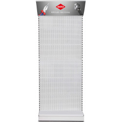 Pentru echipare individuală la faţa locului. pentru prezentarea produselor pe suprafețe mari, într-un mod care să stimuleze vânzarea. complet cu stâlpi, 5 panouri perforate, raft de depozitare pe fund și lampă cu mască publicitară transparentă. pentru echiparea, la alegere, cu ambalaj SB, suporturi pentru clești și / sau coșuri de prezentare. pentru racord electric de 230 V. material: tablă/profil de oțel, vopsită electrostatic, argintie.