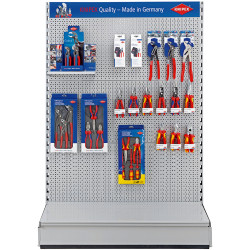Pentru echiparea, la alegere, cu ambalaj SB, suporturi pentru clești și / sau coșuri de prezentare. Pentru echipare individuală la faţa locului. Complet cu stâlpi, șase panouri perforate, două rafturi de depozitare pe fund, fără lampă. Dimensiuni (B x H x T): 1000 x 1400 x 930 mm.