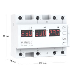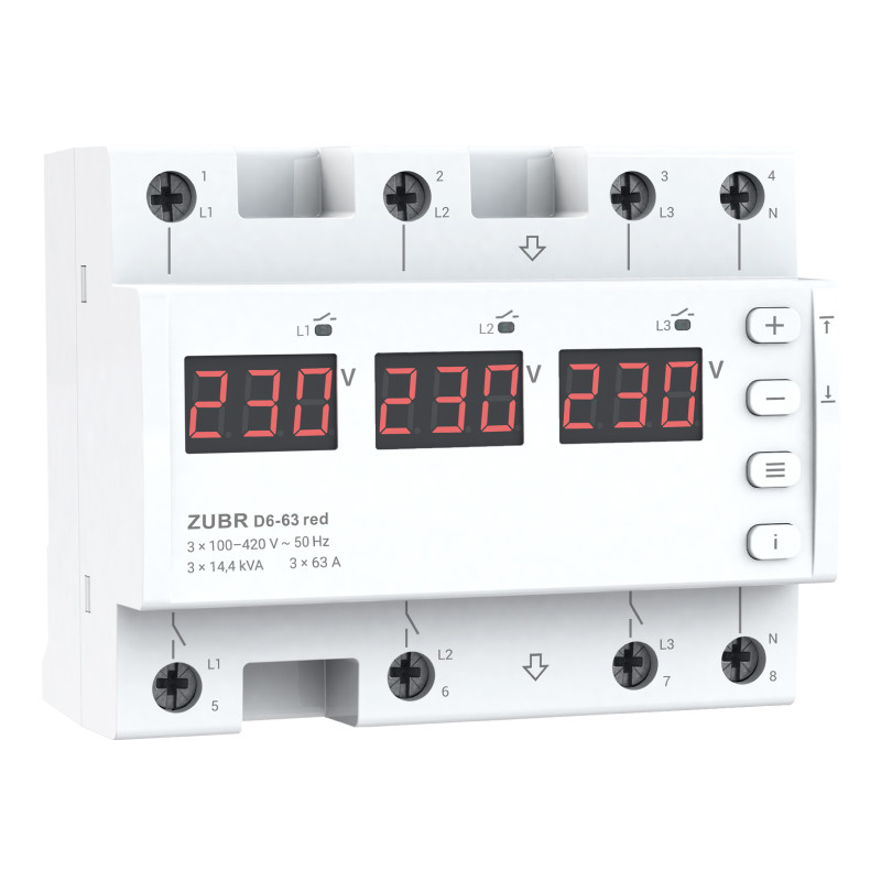 Releul de monitorizare a tensiunii ZUBR D6 este conceput pentru a proteja echipamentele electrice casnice și industriale (inclusiv motoarele electrice trifazate) de tensiune înaltă și joasă, precum și de întreruperea la zero. În timpul funcționării, măsoară și afișează valoarea tensiunii curente pe fiecare fază. Toate setările și valorile alarmei sunt stocate în memoria nevolatilă.