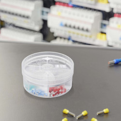 Dozator practic, posibilitate de stivuire și resigilare. Dozator ergonomic, transparent. Capac rotativ cu orificiu pentru preluarea de ferule individuale. Cu ferule izolate în conformitate cu codul de culori DIN. Format: Ø 90 mm, înălțime 44 mm. 20 AEH pentru 2 x 4 mm², câte 10 pentru 2 x 6 mm² / 2 x 10 mm², 5 pentru 2 x 16 mm².