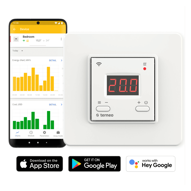 Utilizati aplicatia Terneo sau comandati prin voce cu Google Home pentru a controla incalzirea de oriunde. Cu aplicatia pentru PC my.terneo.ua, puteti lucra cu statistici pe un grup de termostate, obtinand acces instantaneu la temperatura locuintei, dinamica incalzirii si rapoartele energetice in kWh si bani.