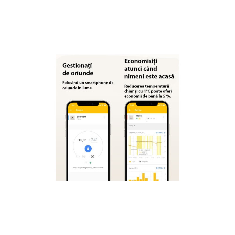 Reglati temperatura cu usurinta prin comenzi vocale cu ajutorul Google Assistant sau folosind aplicatia Terneo de pe smartphone-ul tau. Indiferent de locatia ta in lume, controlul total al incalzirii casei tale este la indemana ta.